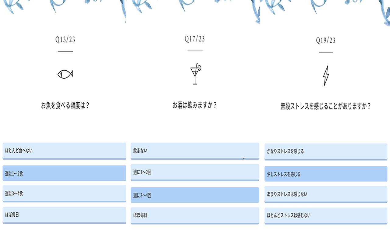 他にも普段食べているものや、お酒の頻度など詳細かつ分かりやすく質問が進んでいきます。