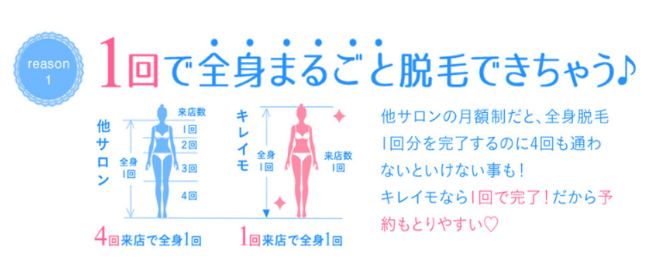 「KIREIMO」ならたったの1回来店しただけで全身脱毛が完了します!