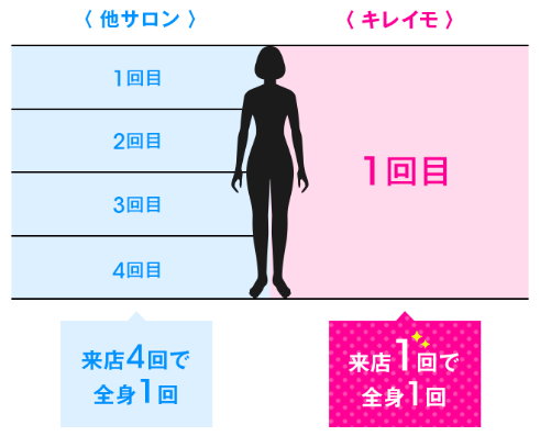 全身脱毛プランと言っても他の脱毛サロンだと何回も通って徐々に全身を脱毛していくのですが、キレイモでは1回の施術で全身やってくれるんです!