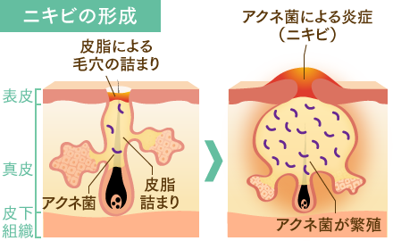 この過剰分泌された皮脂が毛穴に詰まりアクネ菌が繁殖してしまいニキビになるんです。