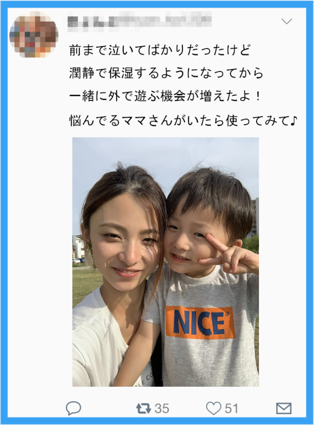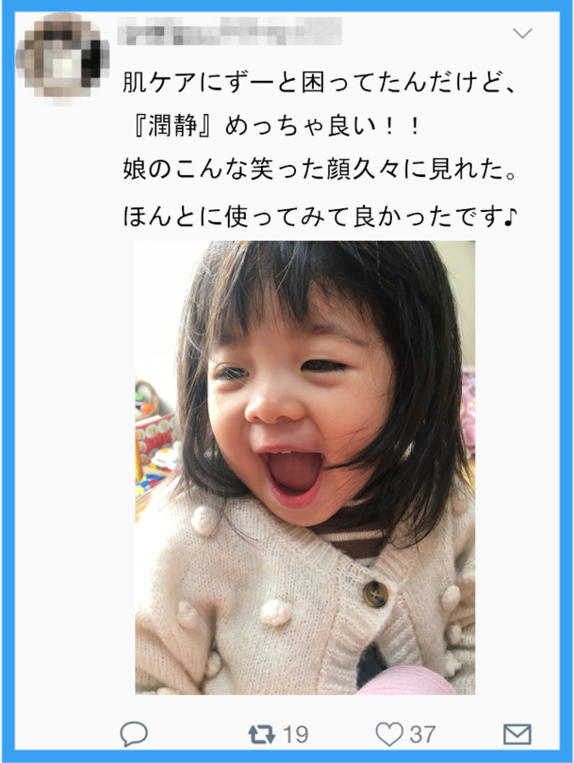 うちの子は生まれたときから肌がかなり弱くて、ケアが大変だったんですけど潤静を使うようになってからは頻繁に病院へ行くことも無くなったのでとっても助かってます(^^)/